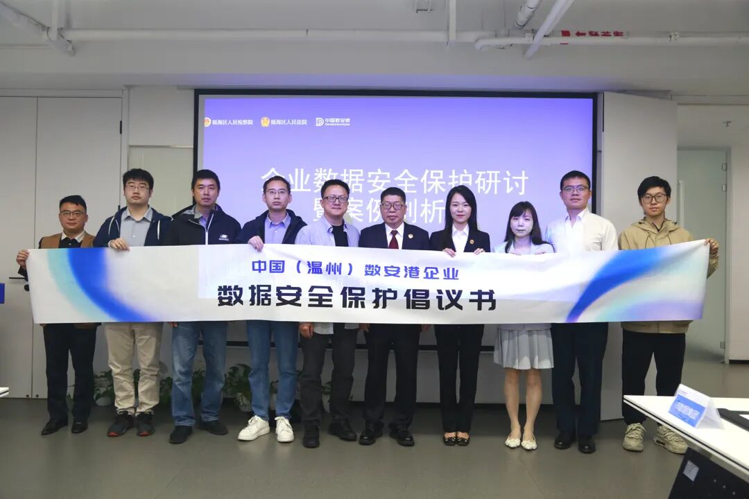 最后,在瓯海区检察院的倡导下,在场多家安全技术单位联合发起《中国(温州)数安港企业数据安全保护倡议书》,提出了引进“数据安全顾问”,推广数据安全监测等8点倡议,呼吁所有企业携手行动,共同提升数据安全保护水平,营造安全、可靠的数据产业生态。