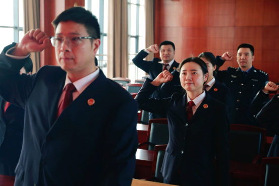在庄严的国歌声中,干警们整装肃立、精神饱满、高举右拳,庄严宣誓。铮铮誓言,既是对宪法权威的崇高敬意,也是对检察使命的郑重承诺。